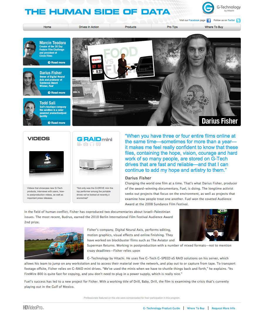 My role as art director and lead designer in the project was to develop the design concept and design execution for the G-Technology landing page, banner ads and responsive email campaign for HD Video Pro Magazine.